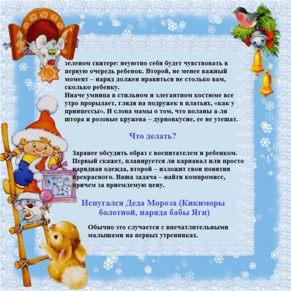 Мнение экспертов. «Деда Мороза лучше приглашать к детям от 4 лет, дети до 3 лет могут испугаться, при этом отцу ребёнка не следует самому переодеваться в сказочного волшебника. Если ребёнок по голосу все же узнает родного отца, то это вызовет недоверие к его персоне. Поэтому в возрасте до 3 лет лучше ограничиться совместным украшением новогодней ёлки, распаковкой подарков и чтением сказок про Новый год без участия сказочных персонажей»